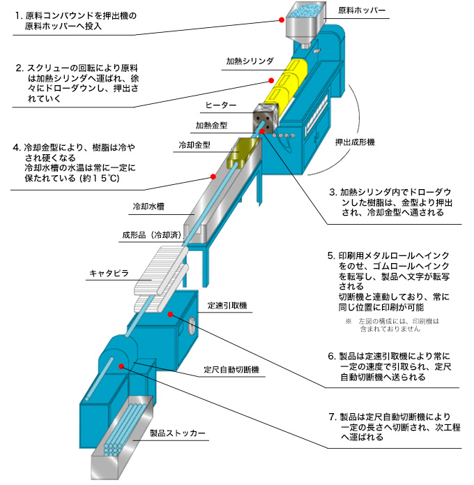 旭プラスチック工業では、製品の製造工程を「押出成形」という技術と専用設備にて行っております。押出成形とはどういう技術なのかについて、具体的にご紹介します。